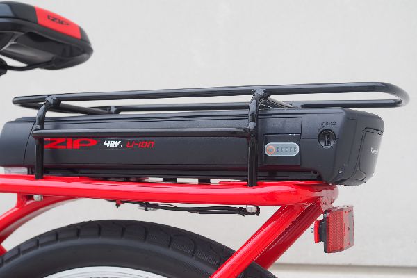 The E3 Vibe plus come equipt with a rear rack mounted Lithium-ion 48V, 8.8Ah 422Wh battery. The battery is removable and locks to the frame.